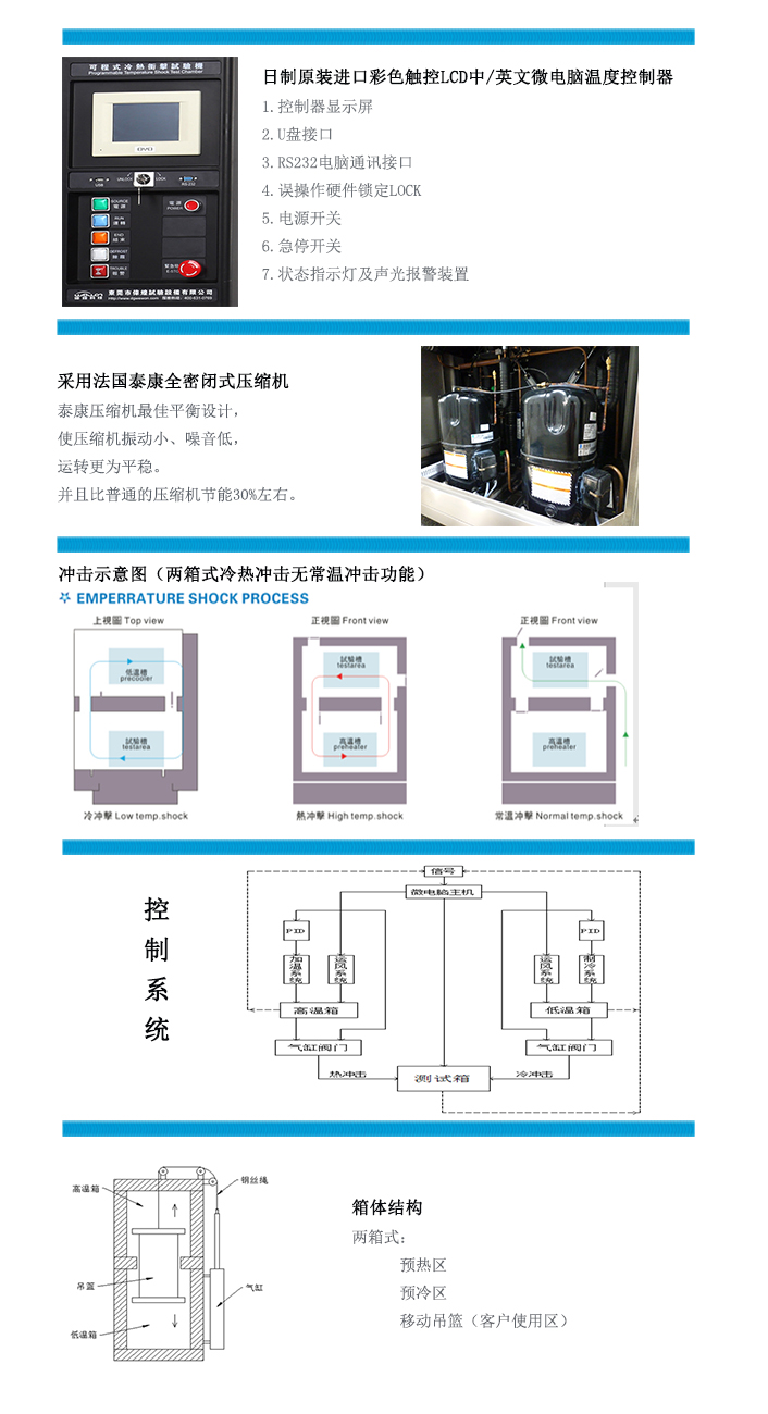 沖擊試驗(yàn)箱安全保護(hù)裝置:無熔絲超載探保護(hù),壓縮機(jī)過熱, 過流, 超壓, 加熱干燒, 箱內(nèi)超溫警報(bào)系統(tǒng).